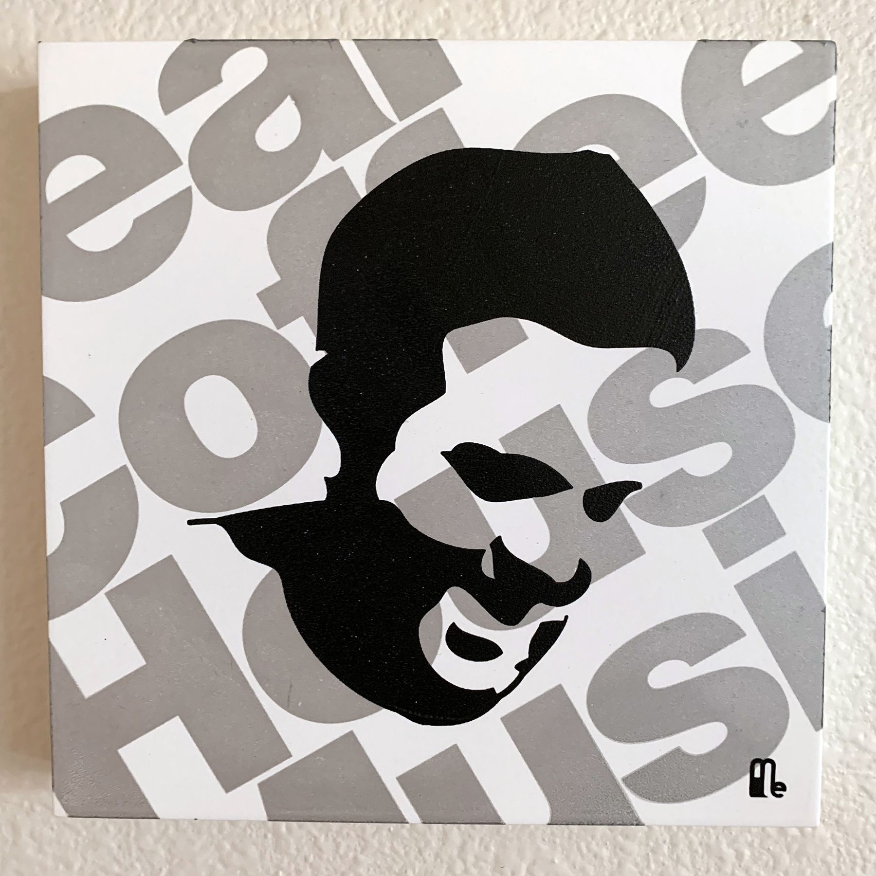 Silver and black screen print on a white wood panel. 6"x6" (7/8" deep). Can mount flush to wall with nails. No framing needed.