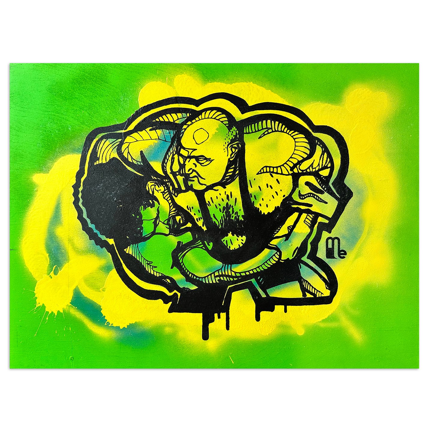 24"x18" screen print on wood panel. 1.5" deep. Can easily mount flush to wall with nails. No framing needed.