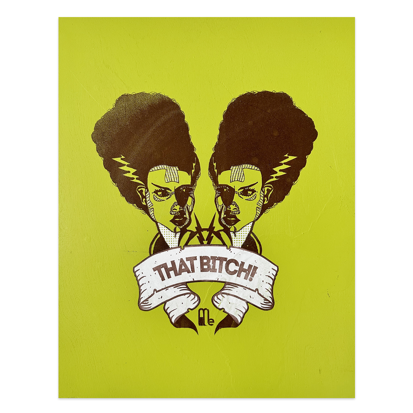 16"x20" spray paint and screen print on wood panel. 1.5" deep. Can easily mount flush to wall with nails.