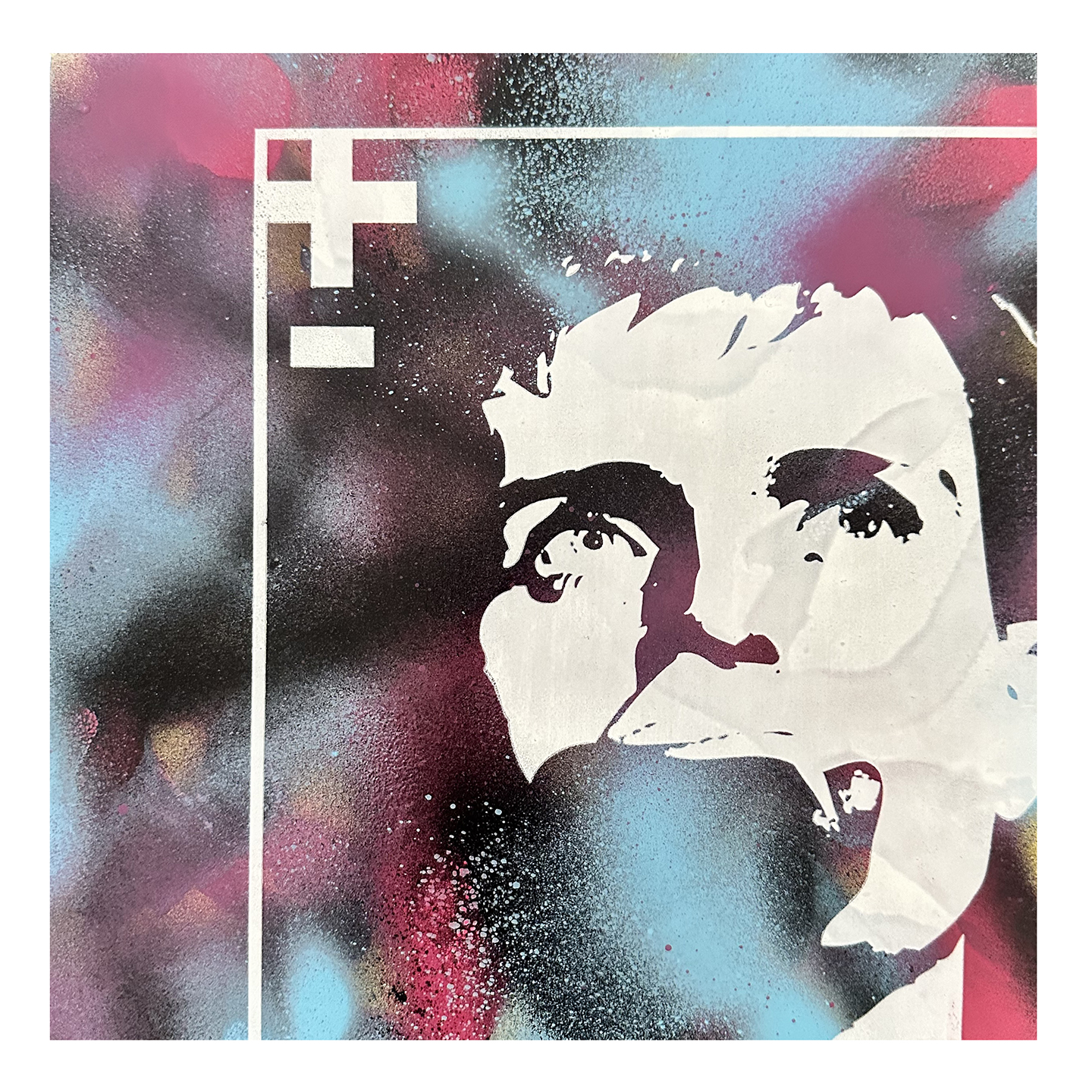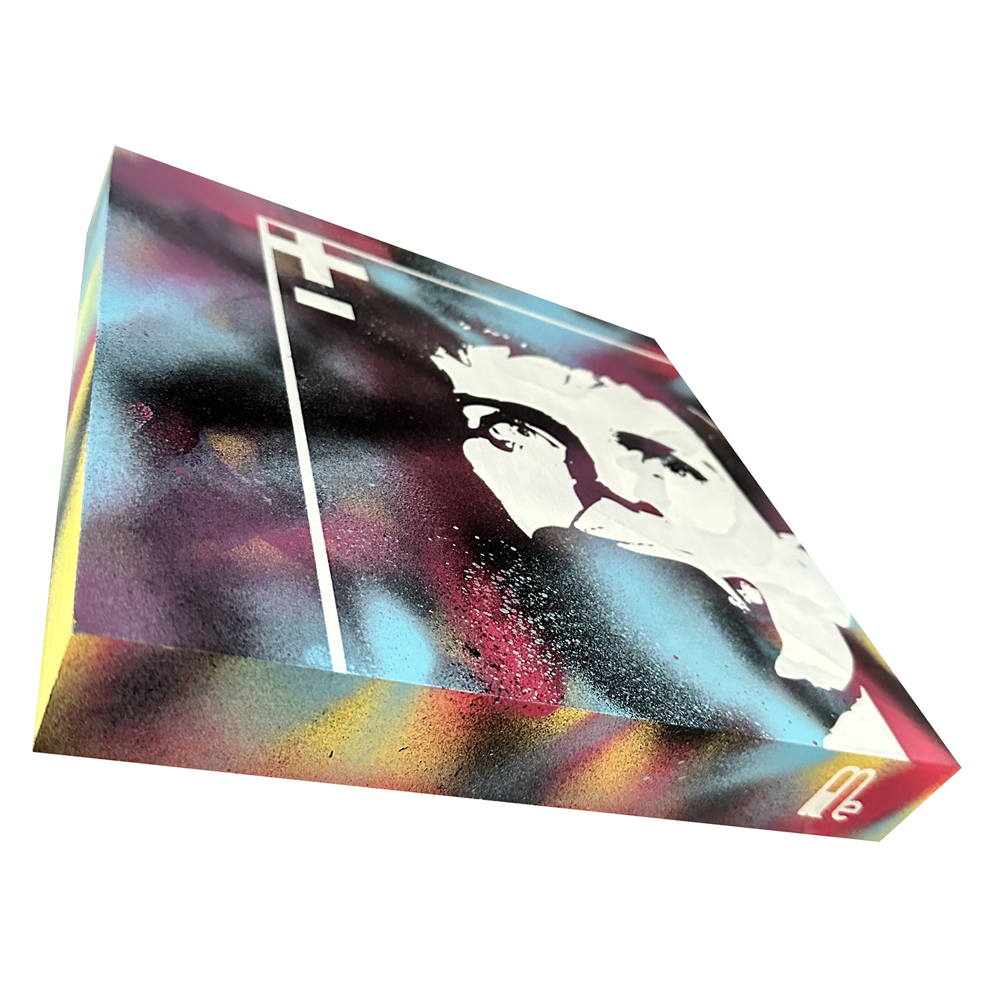 10"x10"x1.5" wood panel. Custom spray paint and silk screen.